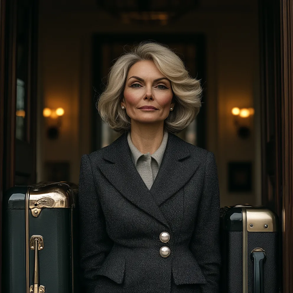 I opened the door to a woman in a prim navy coat with pearl buttons, flanked by two enormous suitcases that looked like they’d survived the Titanic.