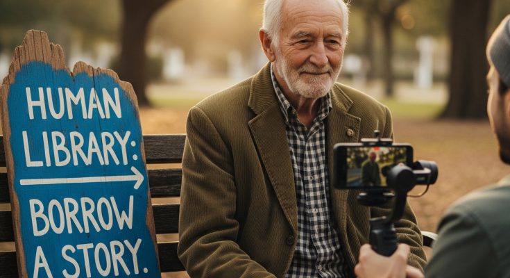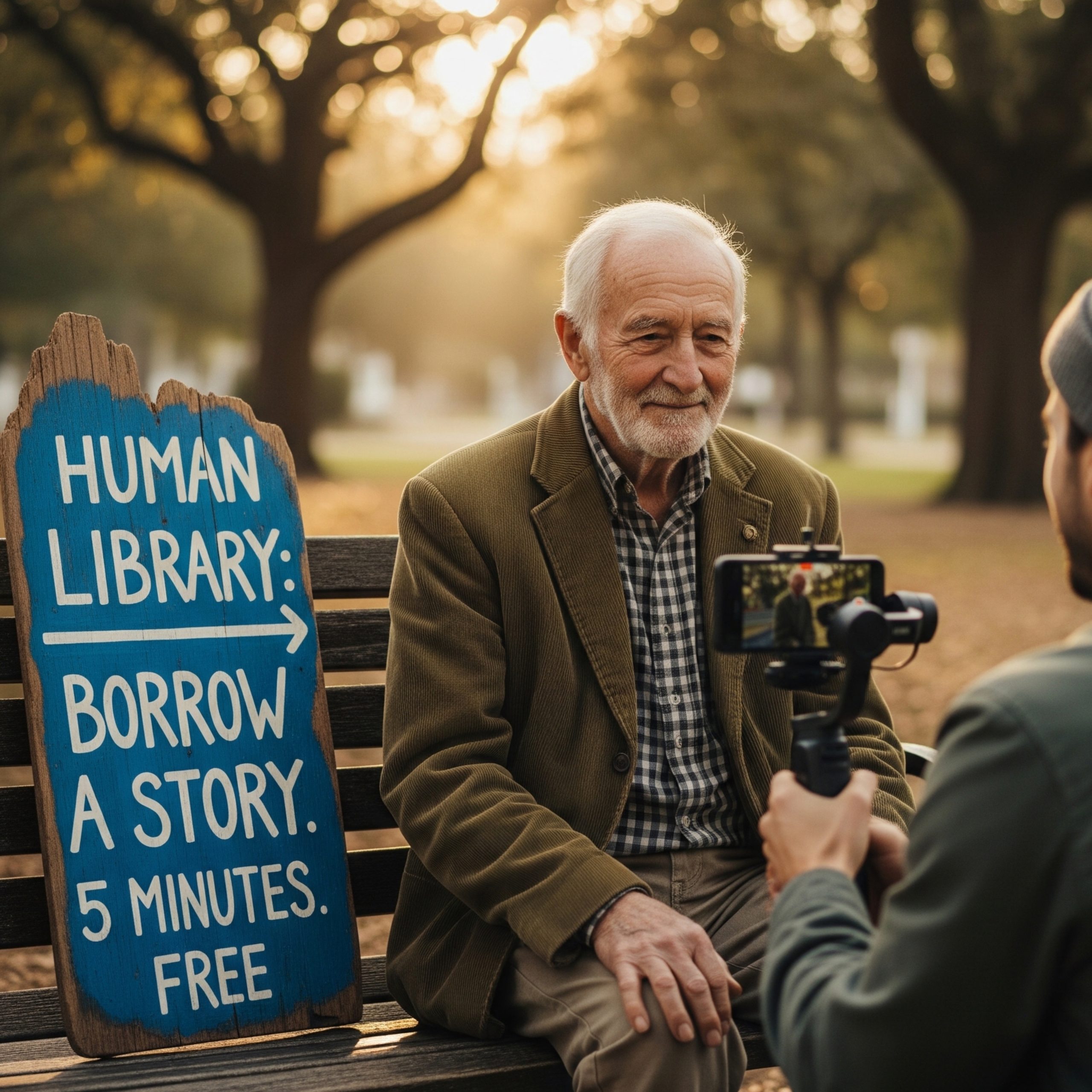 It was filmed in 4K, stabilized, with a trendy lo-fi beat playing in the background. The creator, a twenty-year-old named Jax with twelve million followers, pointed his camera at a man sitting on a park bench. The man looked to be about eighty, wearing a corduroy jacket that had seen better decades. Beside him was a hand-painted wooden sign: “HUMAN LIBRARY: BORROW A STORY. 5 MINUTES. FREE.”